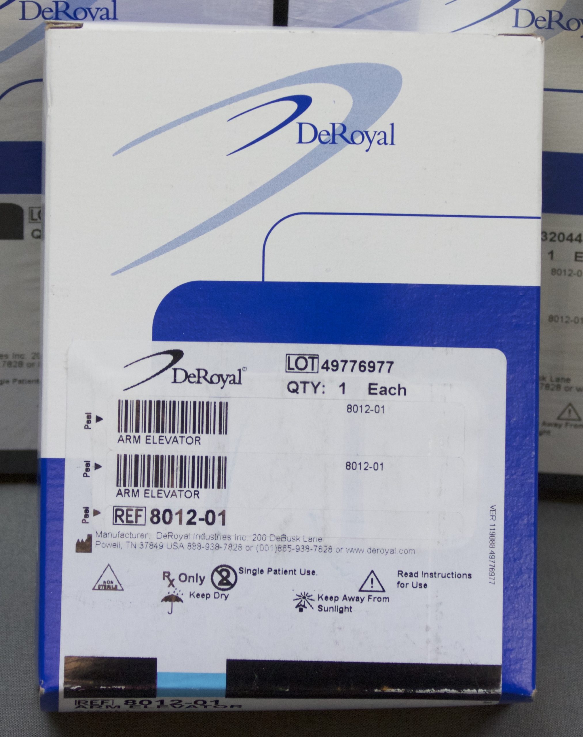 This listing is for 8 DeRoyal 8012-01 arm elevator. These items are new. Some are missing the plastic wrapping, and the packaging may be distressed. You will receive 8 DeRoyal 8012-01 arm elevator (only what is pictured). Thanks for looking.
