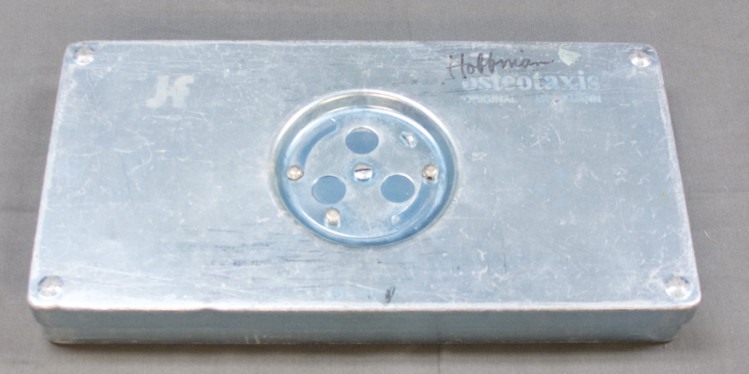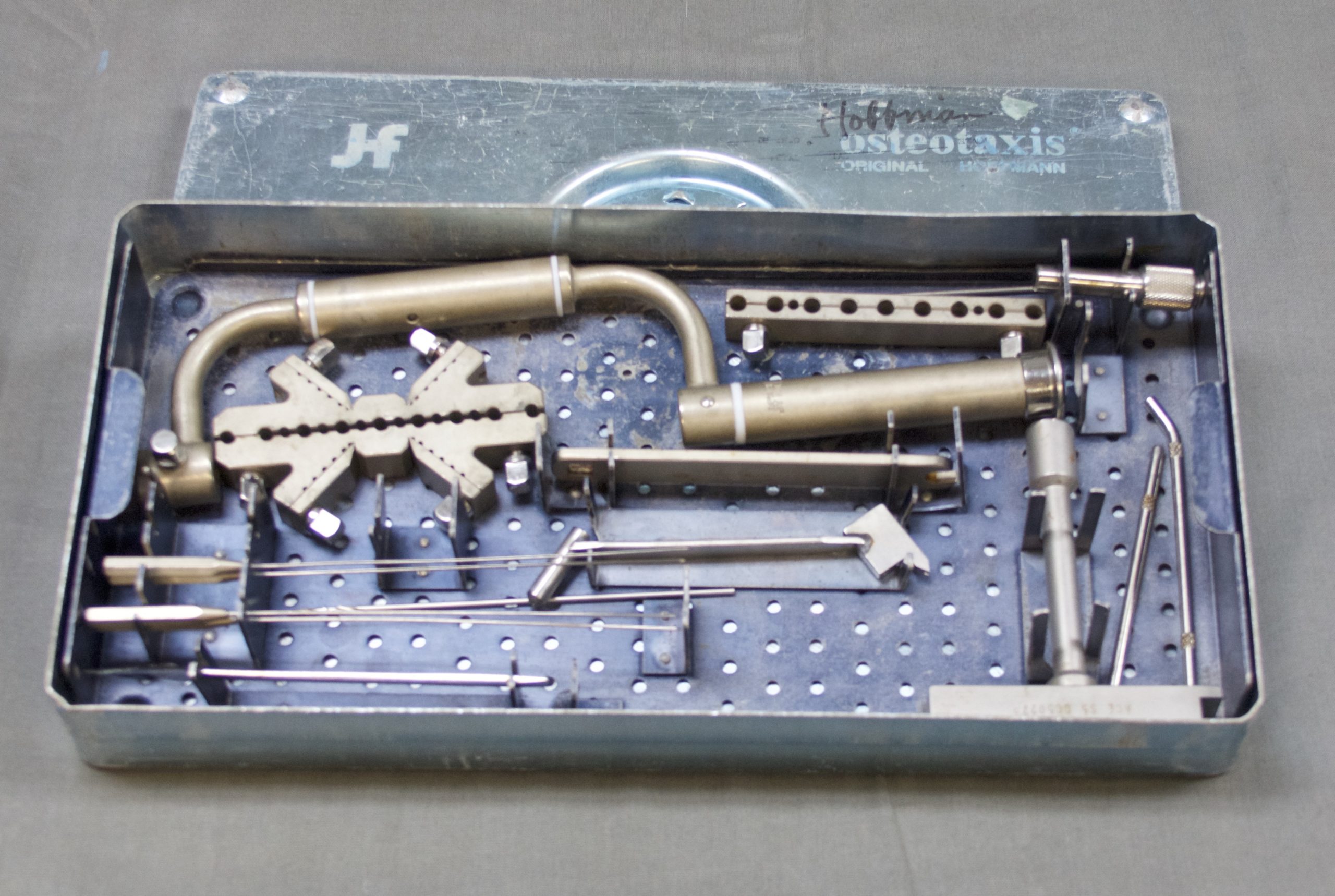 One Hoffman Osteoaxis surgical instrument set. This item is in good condition overall, with some scuffs/scratches from use. You will receive one Hoffman Osteoaxis surgical instrument set (only what is pictured). This item will have a 30 day warranty. Thanks for looking.
