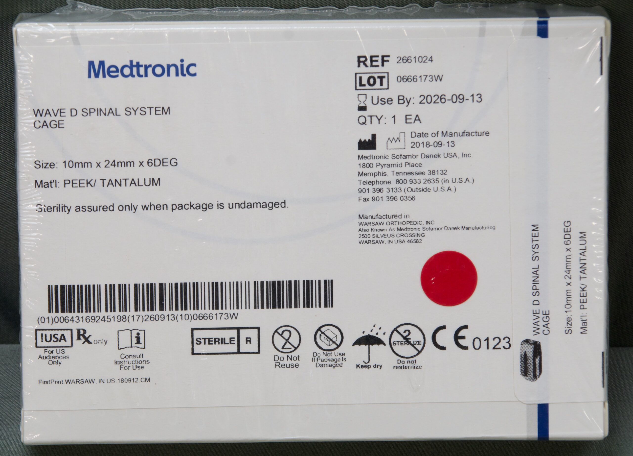 One Medtronic 2661024 Wave D Spinal System Cage. This item is new. The expiration dates range from 9-13-2026 to 8-30-2027. You will receive one Medtronic 2661024 Wave D Spinal System Cage (only what is pictured). Thanks for looking.