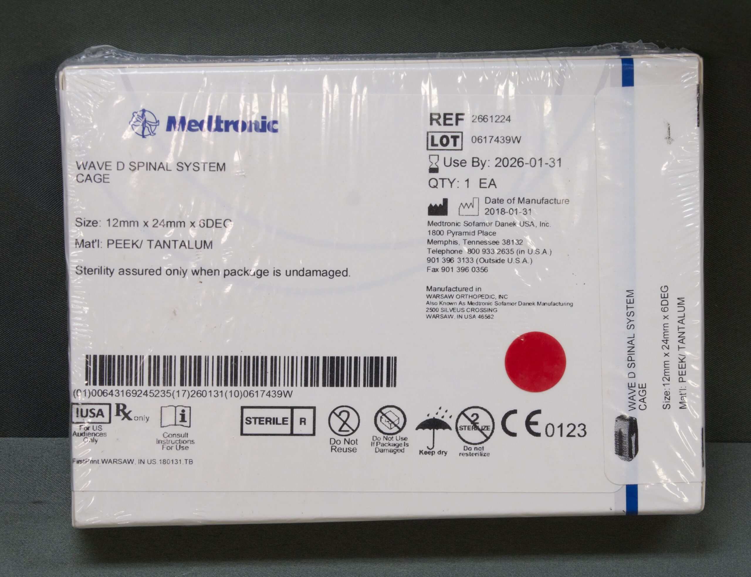 One Medtronic 2661224 Wave D Spinal System Cage. This item is new. The expiration dates range from 1-31-2026 to 8-10-2026. You will receive one Medtronic 2661224 Wave D Spinal System Cage (only what is pictured). Thanks for looking.