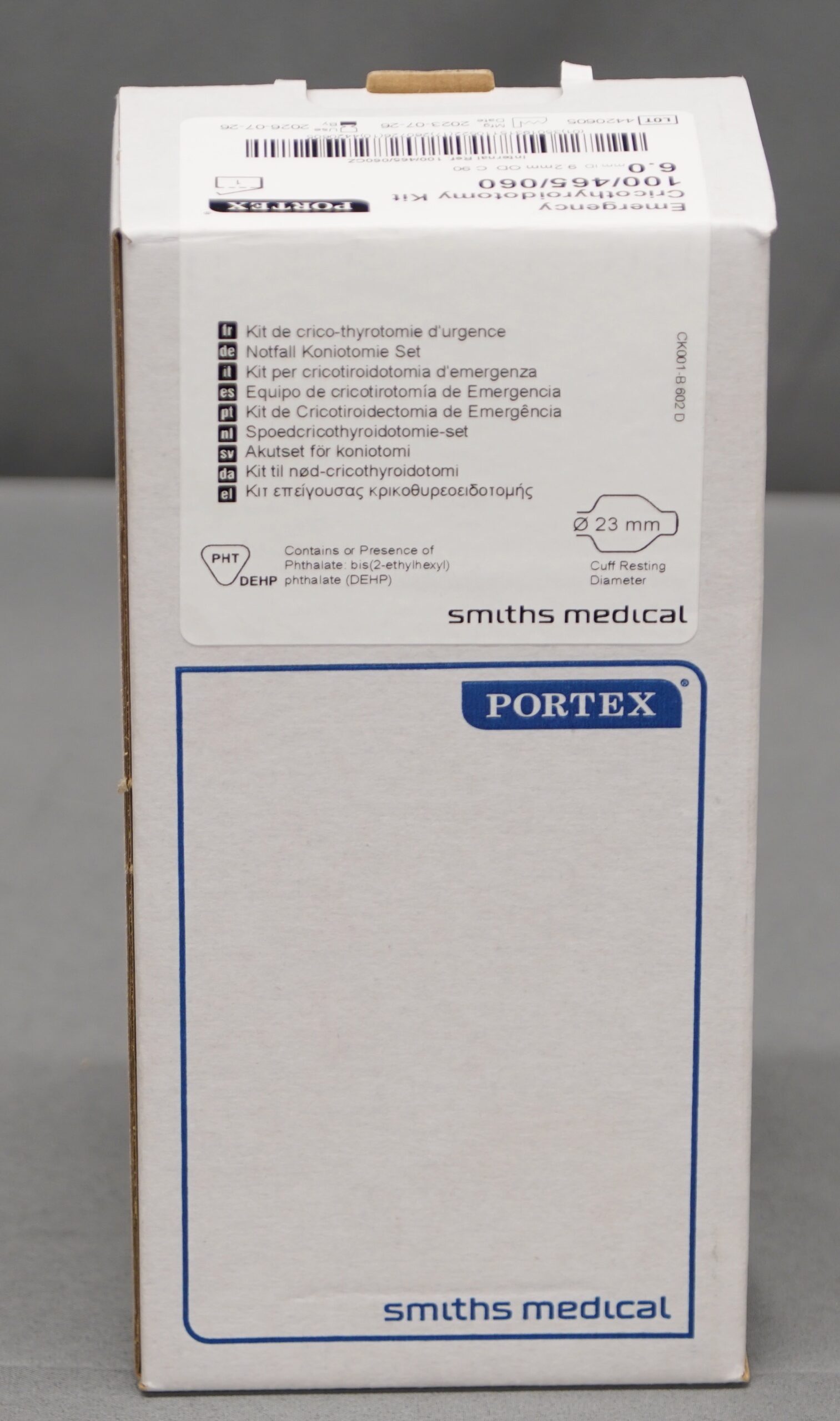 One Smiths Medical Portex Cricothyrotomy kit. This item is new. The expiration date is 7-26-2026. You will receive one Smiths Medical Portex Cricothyrotomy kit (only what is pictured). Thanks for looking.