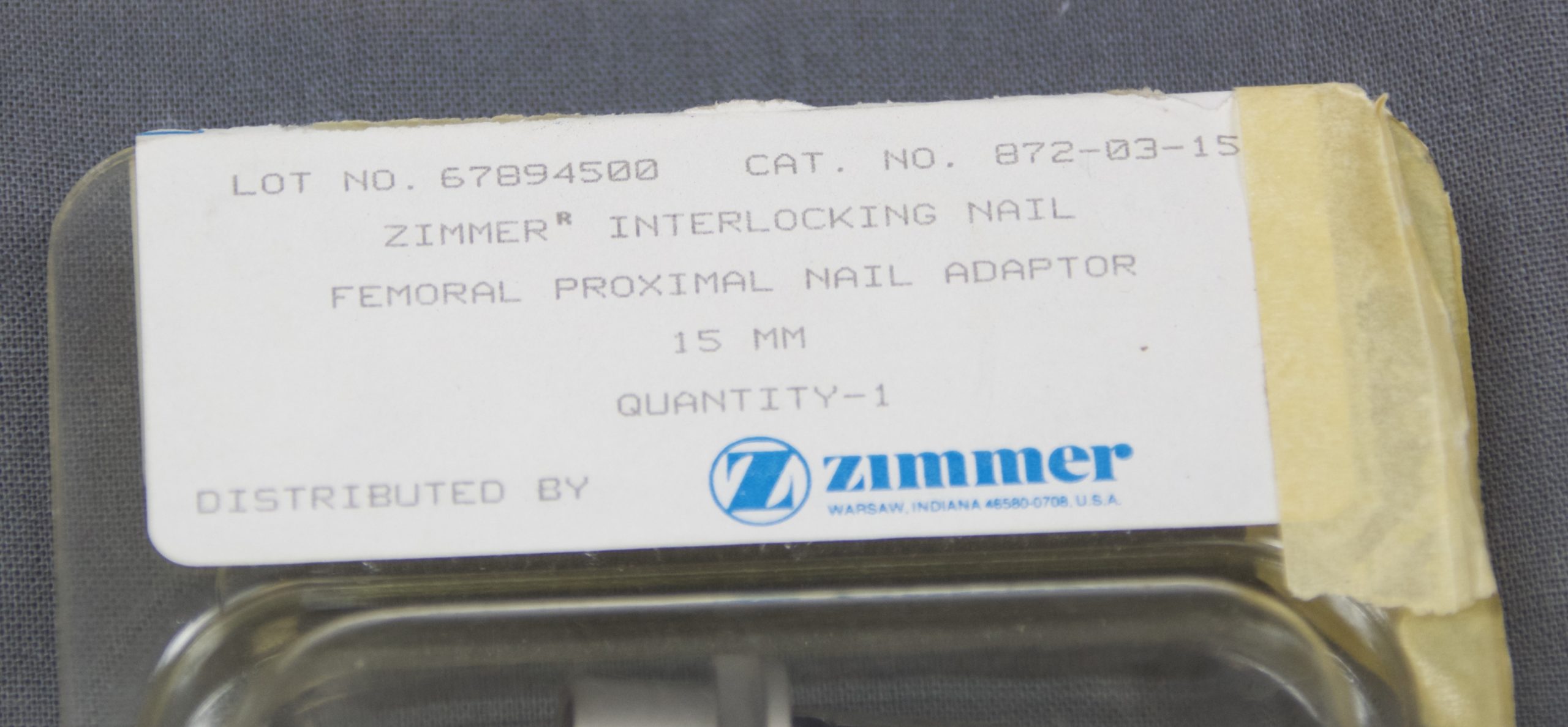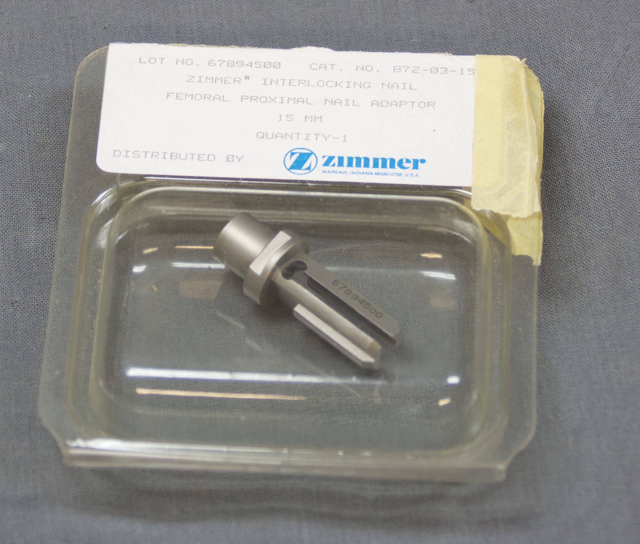 One Zimmer 872-03-15 interlocking femoral proximal nail adapter. This item is in good condition overall, with some scuffs/scratches from use. You will receive one Zimmer 872-03-15 interlocking femoral proximal nail adapter (only what is pictured). This item will have a 30 day warranty. Thanks for looking.